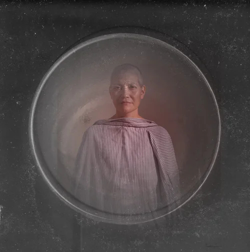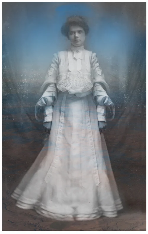 In these found 19th century portraits, I see a glimpse of myself. These once living individuals are now lost and forgotten. The images in this series have been manipulated to include the hair or eyes of my own genetic family members, as well as the imposed imperfections left by time. The juxtaposition of these contemporary elements heightens the rigidness of the original portraits. The images appear to be fleeting yet they are grounded and illogical.